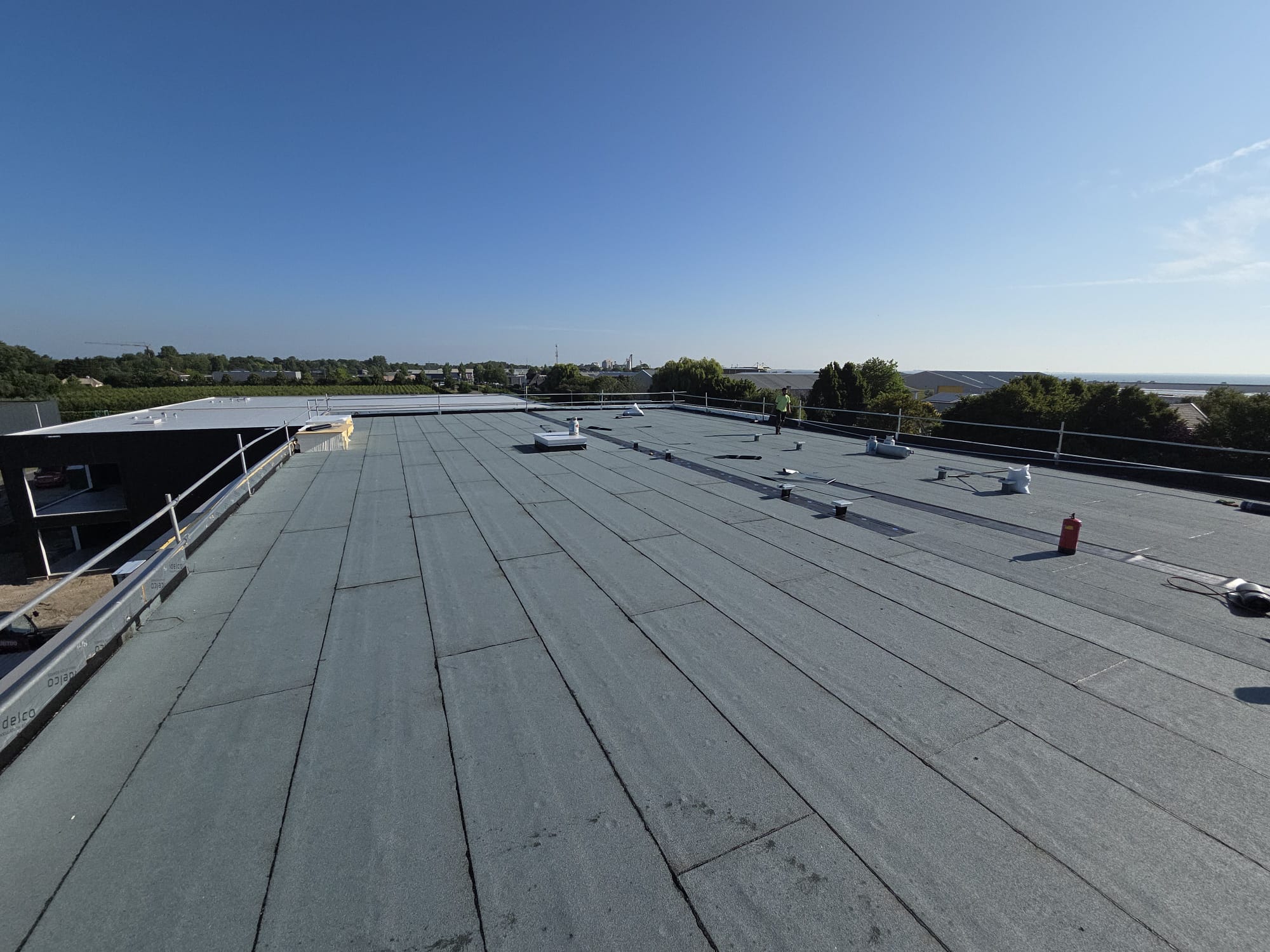 Daarboven is gekozen voor een tweelaags bitumen dakbedekkingssysteem, zorgvuldig aangebracht voor optimale waterdichtheid en langdurige bescherming tegen weer en wind.