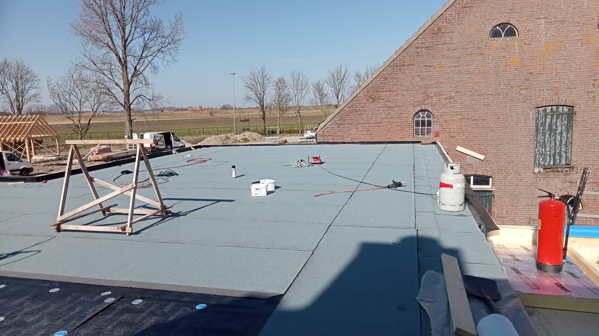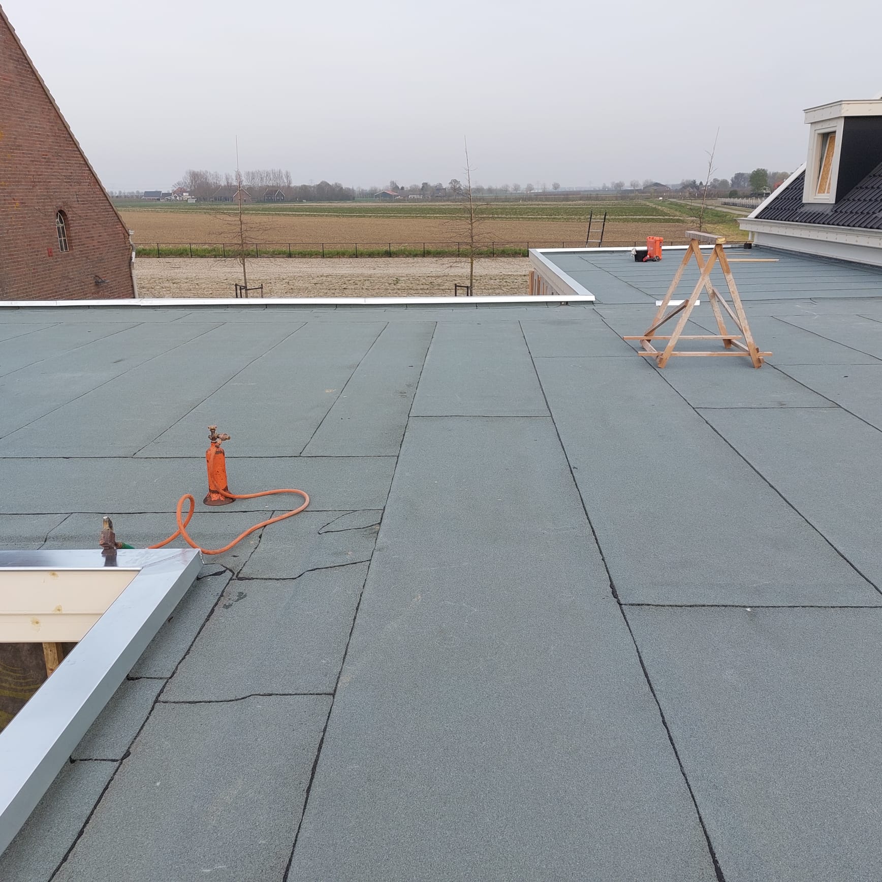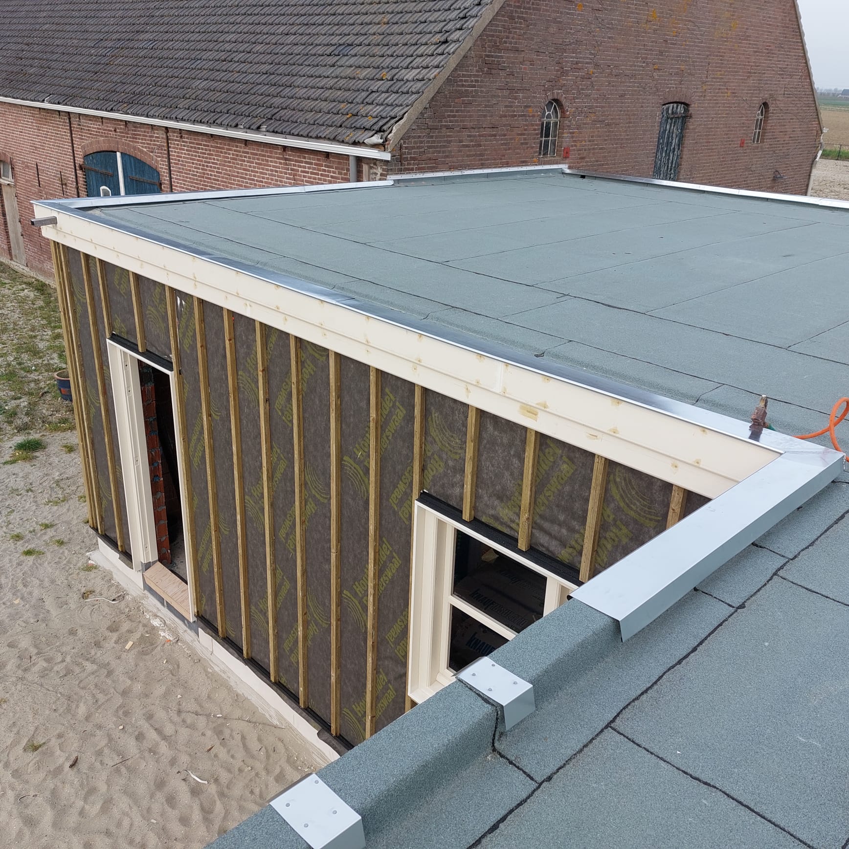 Platte daken van een boerenschuur te Waarde voorzien van PIR-afschotisolatie + 2-laags bitumen inclusief zinken dakranden.