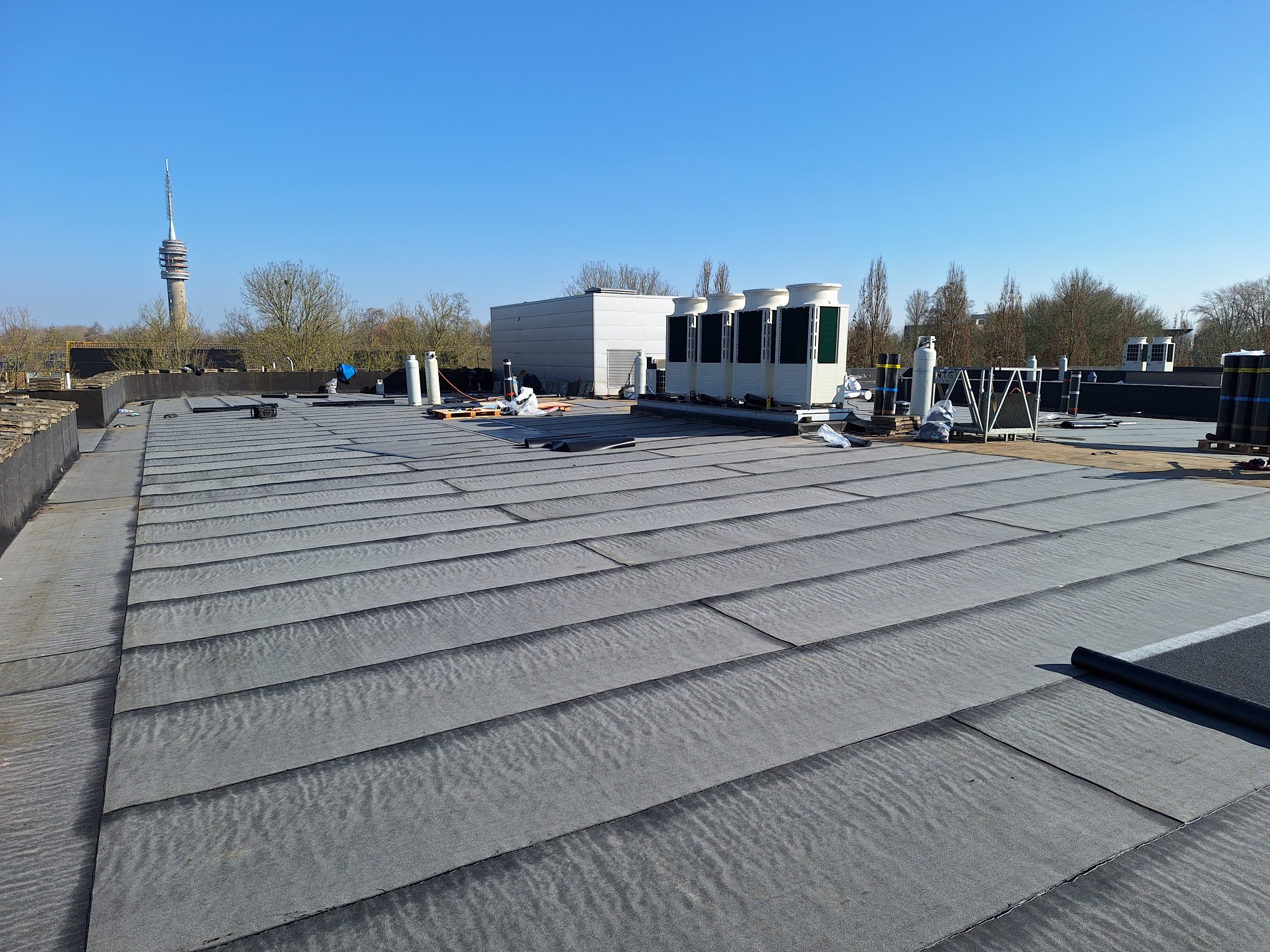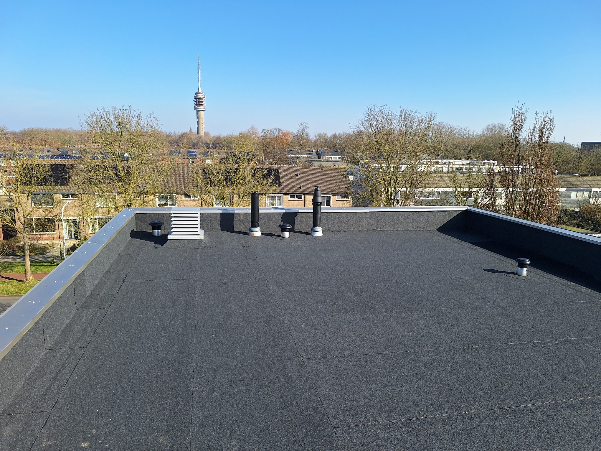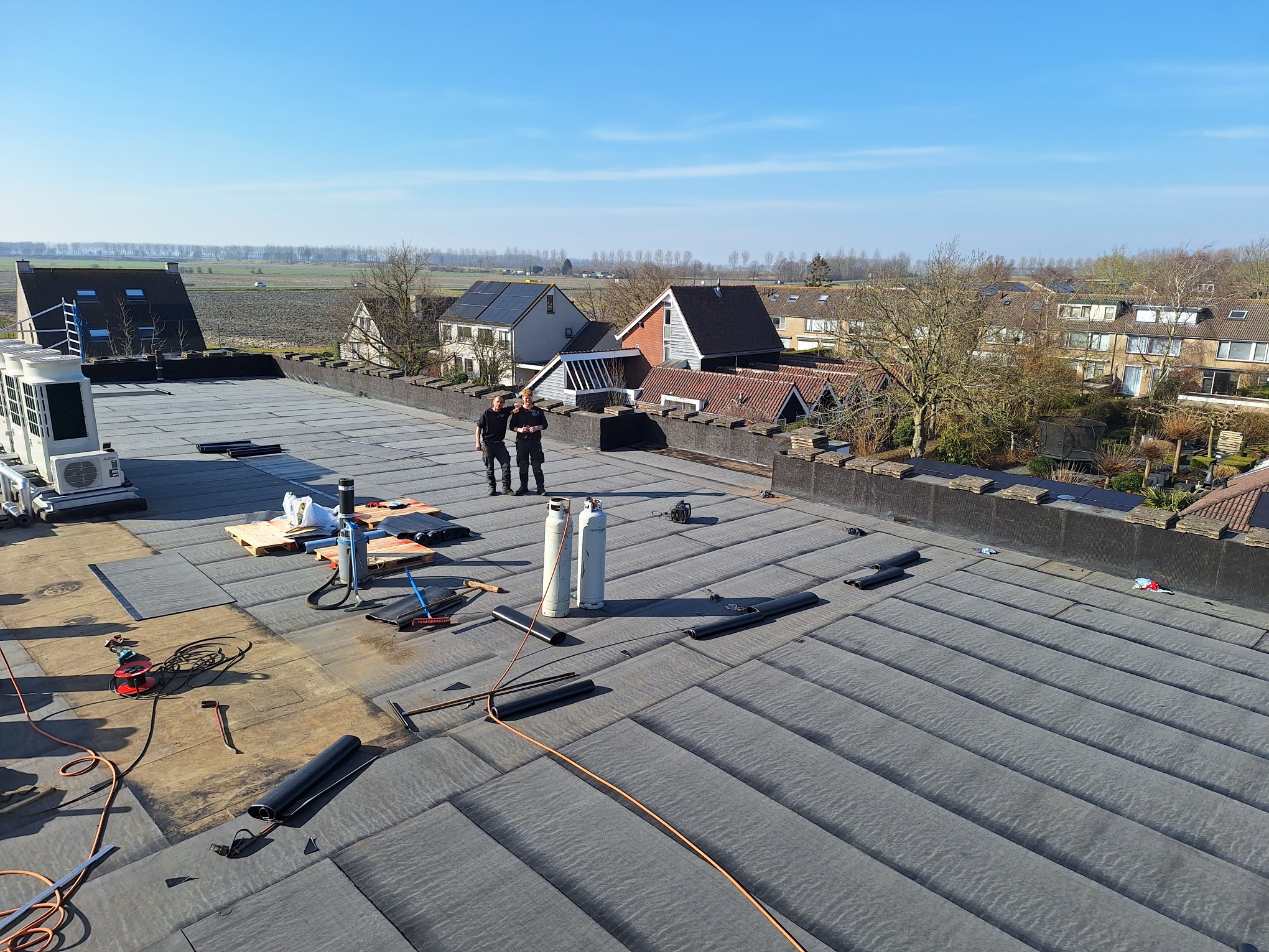 Voor Schipper Accountants in Goes hebben we het dak volledig vernieuwd met een nieuwe laag hoogwaardige bitumineuze dakbedekking. Dit materiaal staat bekend om zijn lange levensduur, waterdichtheid en sterke hechting, waardoor het dak optimaal beschermd is tegen alle weersomstandigheden. Later wordt er op een deel van het dak nog een grindlaag als ballast aangebracht, wat extra stabiliteit en bescherming biedt.