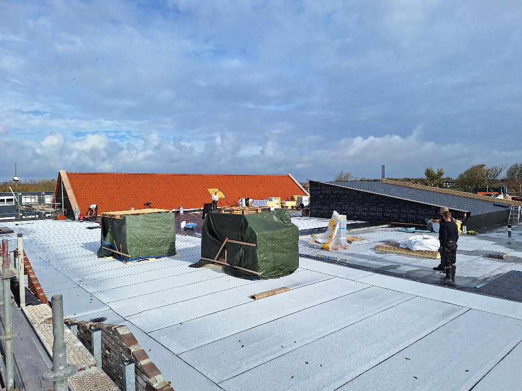 Circa 1.250 m² afschotisolatie en Derbigum met witte leislag, voor een lagere temperatuur op en onder het dak en een comfortabel binnenklimaat.
