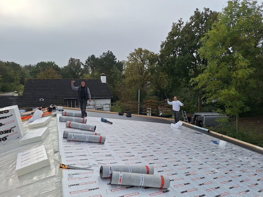 Hier hebben we het dak voorzien van afschotisolatie met een minimale R-waarde van 6. Dit zorgt voor optimale isolatie en energie-efficiëntie. Bovenop de EPDM-dakbedekking (1,5 mm dik) komt later een sedumbedekking, wat bijdraagt aan een groen en duurzaam dak.