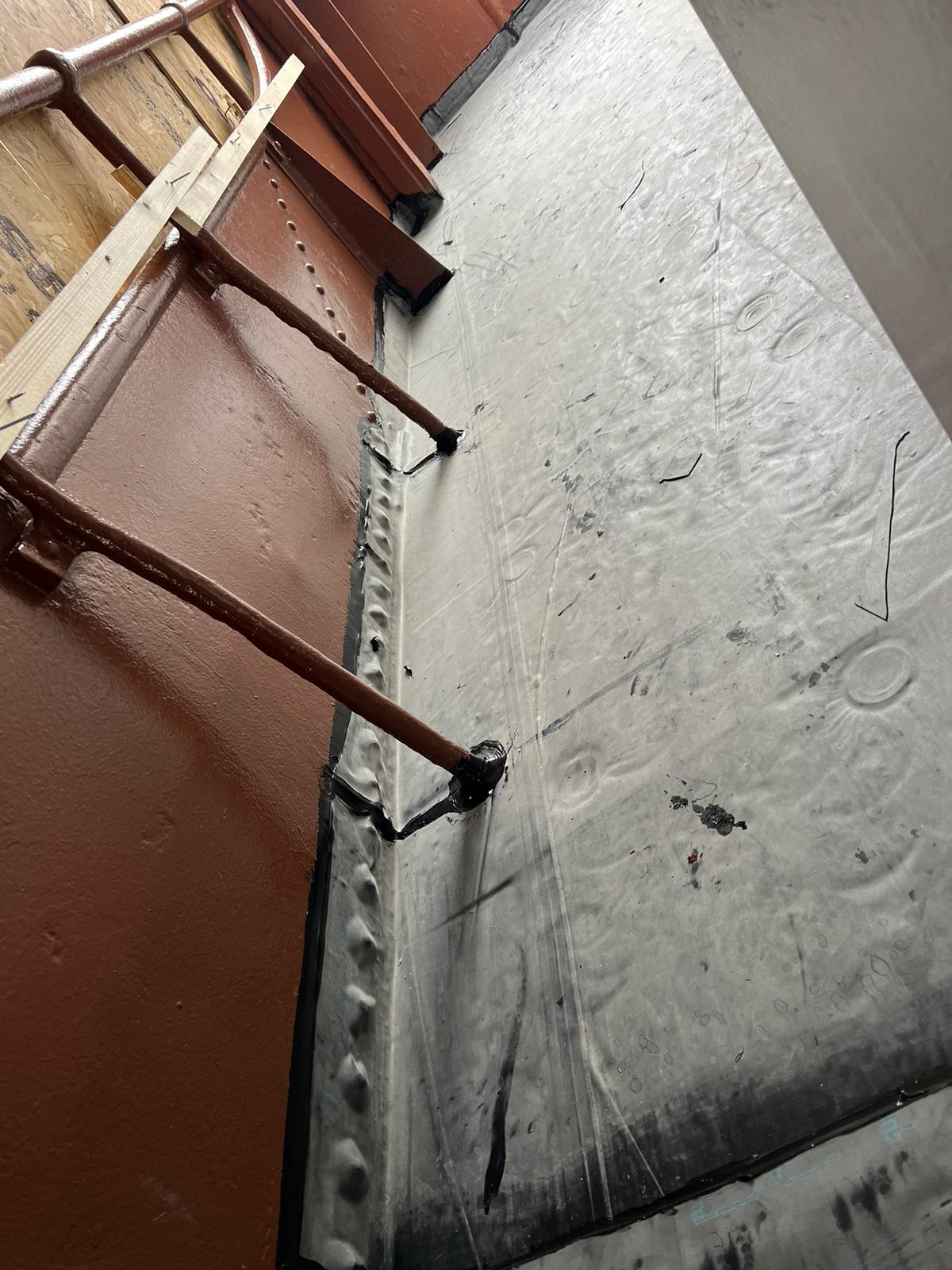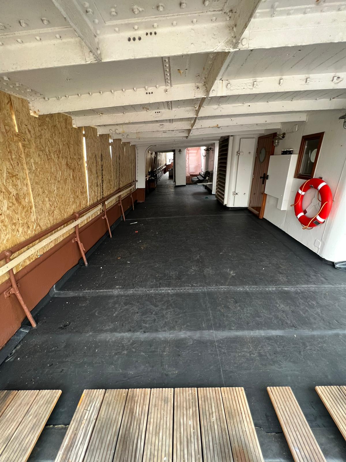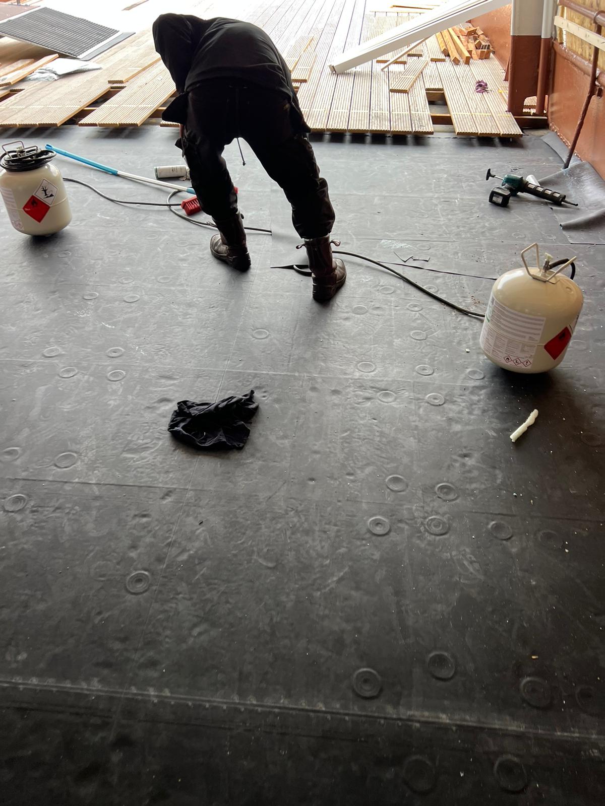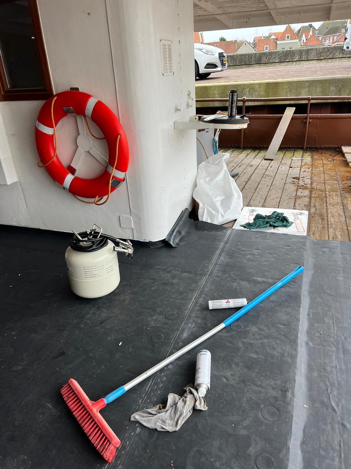 Scheepsdek van hotelboot Kon. de Emma voorzien van laag isolatie en dakbedekking.