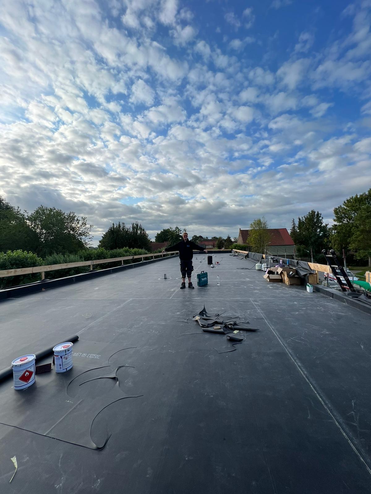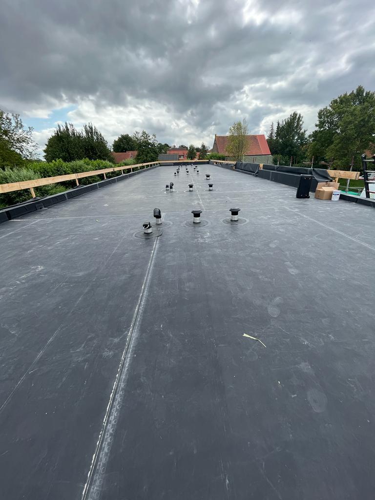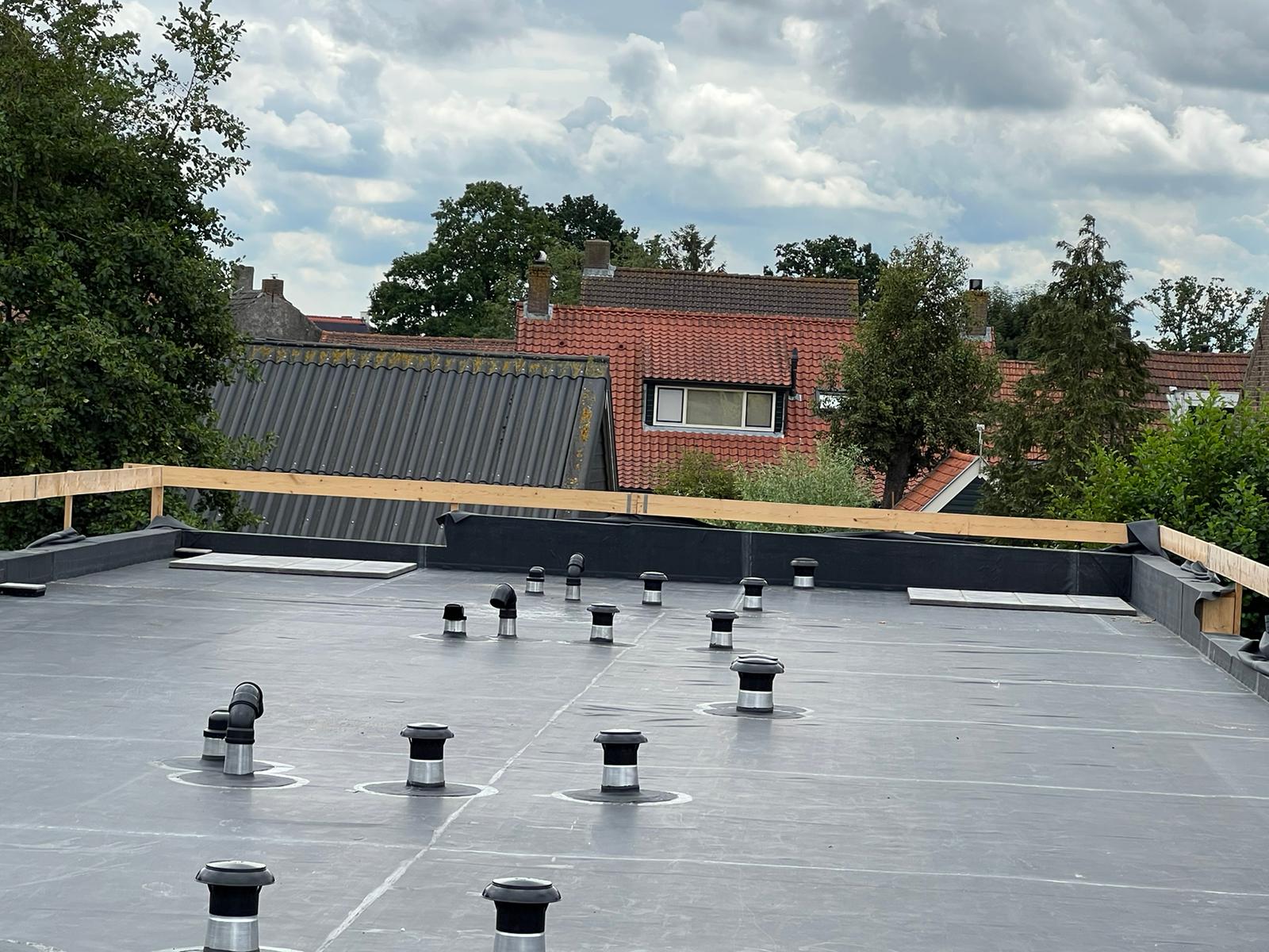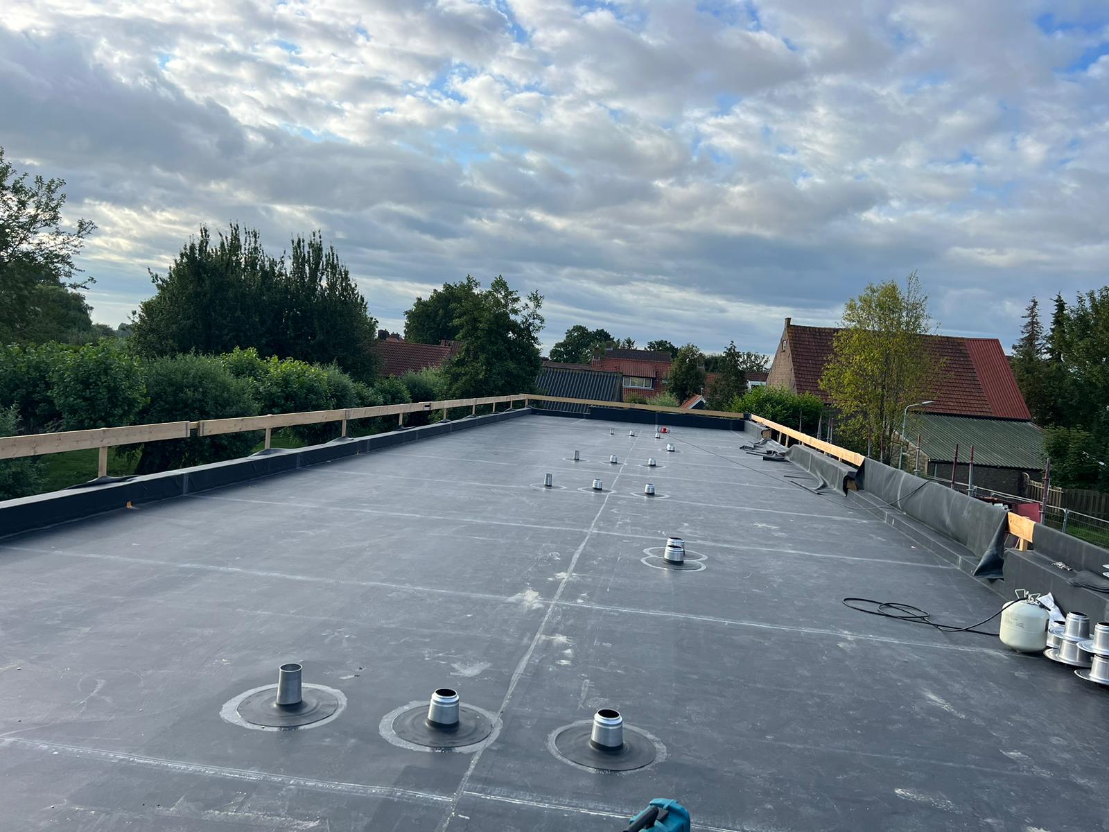 1 van de 7 woningblokken (IJzendijke). Dit project ‘Zeeuws Vlaanderen’ is nu in uitvoering. We gaan hier PIR afschotisolatie (gemiddeld 140 mm dik) en EPDM-dakbedekking plaatsen waar later nog een laag grind overheen komt.