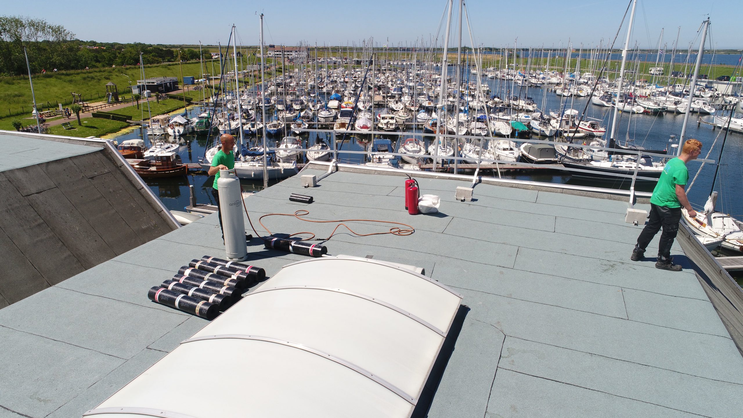 Dakrenovatie uitgevoerd door middel van de huidige dakbedekking te overlagen met een nieuwe toplaag van topkwaliteit bitumineuze dakbedekking (Garantgum 470K24) met een lichtgrijze afwerklaag zodat het zonlicht gereflecteerd wordt en er zo een lagere oppervlaktetemperatuur ontstaat waardoor er een koeler binnenklimaat ontstaat en de dakbedekking een langere levensduur heeft.