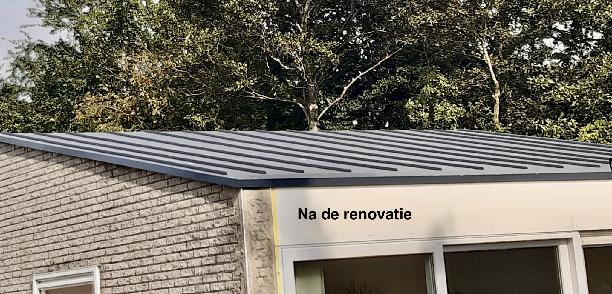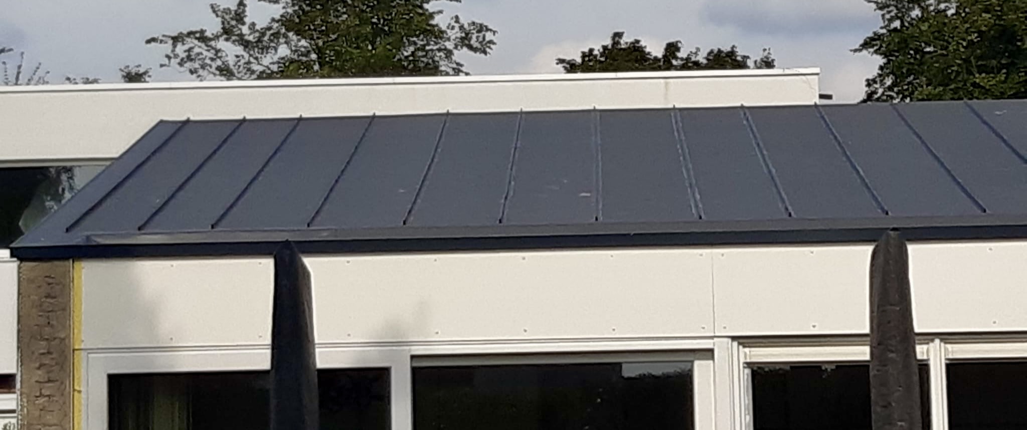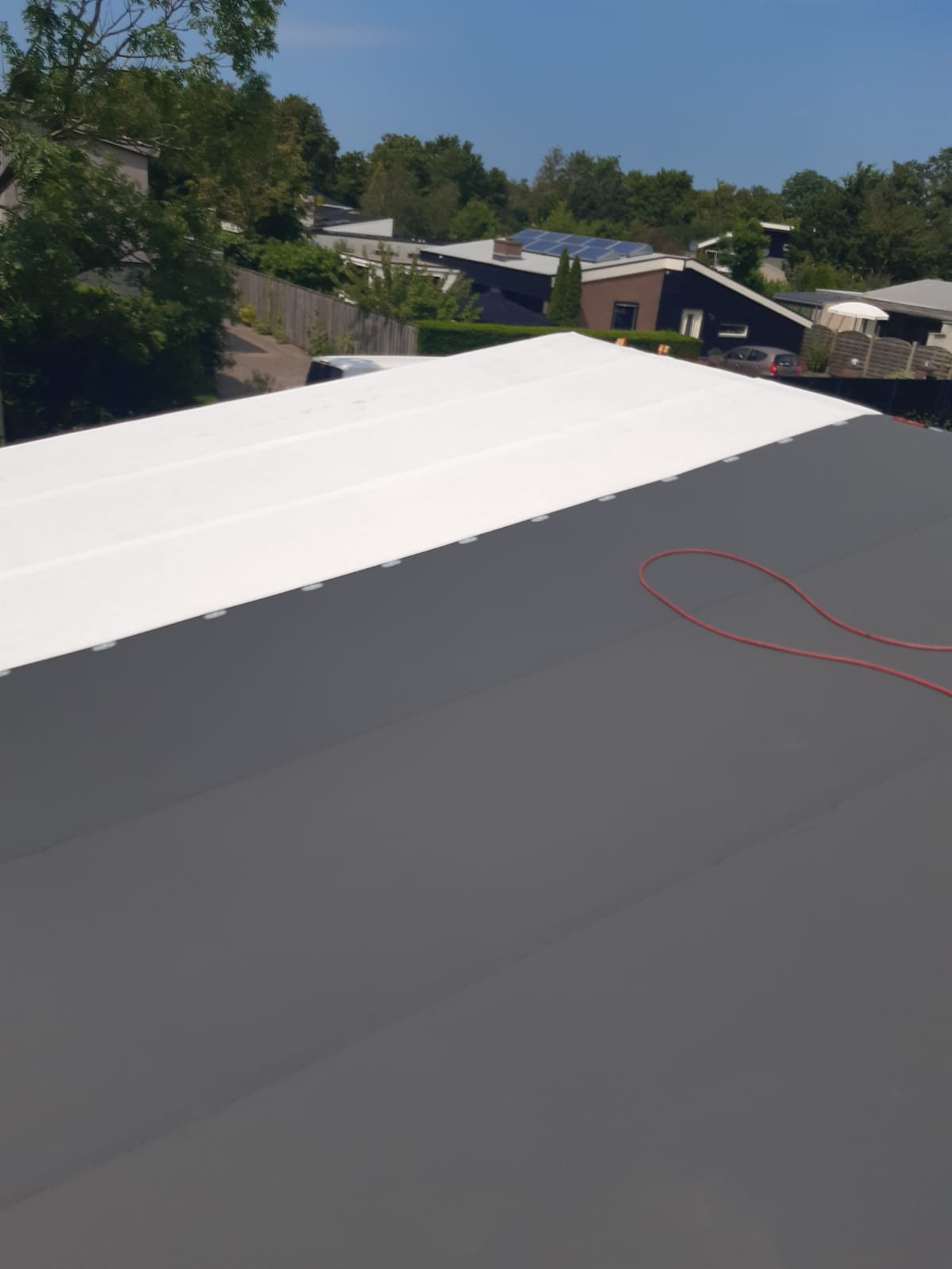 Oorspronkelijk rode dakbedekking is vernieuwd door een renovatie met PVC dakbedekking inclusief roefprofielen om zo een uitstraling van een zinkdak te krijgen. Zie foto’s vooraf (rode dakbedekking), foto’s tijdens de uitvoering en het eind resultaat.