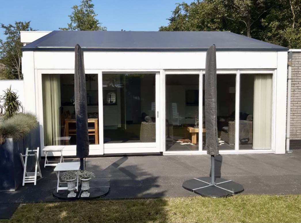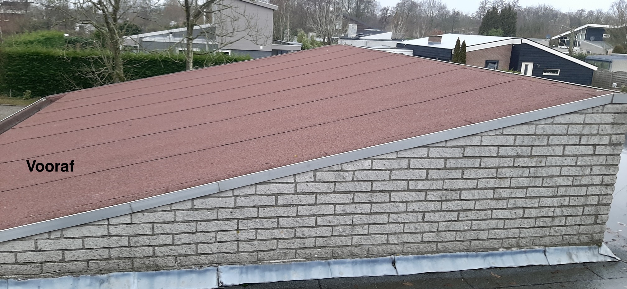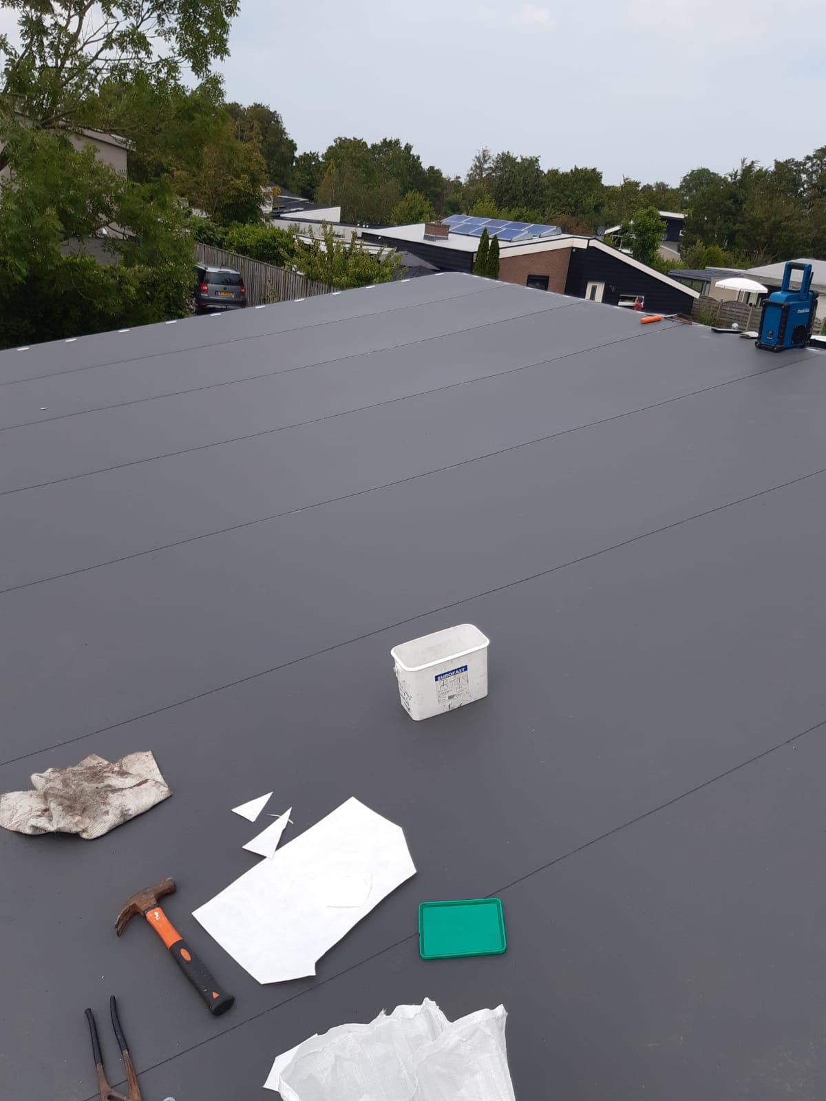 Oorspronkelijk rode dakbedekking is vernieuwd door een renovatie met PVC dakbedekking inclusief roefprofielen om zo een uitstraling van een zinkdak te krijgen. Zie foto’s vooraf (rode dakbedekking), foto’s tijdens de uitvoering en het eind resultaat.